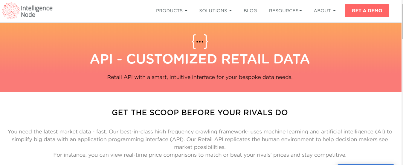 The Intelligence Node Infeed API provides the latest retail data powered by machine learning, and artificial intelligence. This API offers endpoints for timestamps, orders, product details, discounts, shipping, inventories, and more.